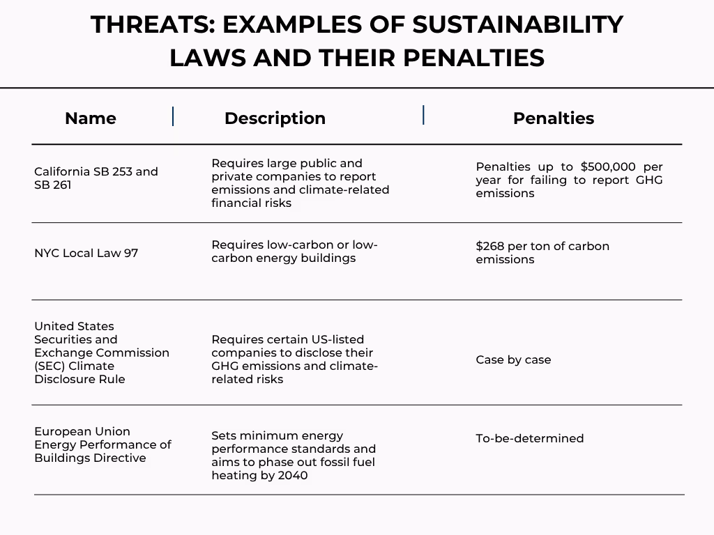 For instance, New York’s Local Law 97 (LL97) mandated that most buildings over 25,000 square feet meet strict GHG emissions limits starting in 2024. More aggressive targets must be hit by 2030 and the goal is to reach net zero by 2050. If a building owner doesn’t invest in capital projects necessary to meet the LL97 threshold, the property becomes harder to finance or sell at market values and potentially unprofitable due to fines.